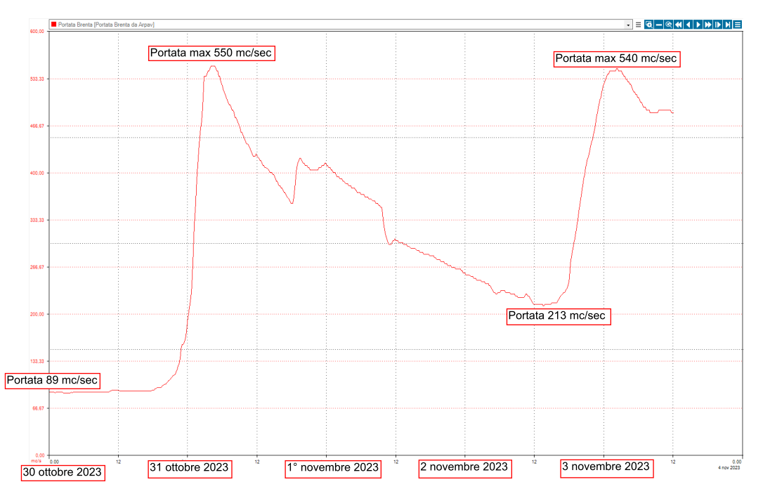 Il Brenta è poi gradualmente sceso per risalire di nuovo in breve tempo tra il 2 e il 3 novembre, portandosi di nuovo a valori di oltre 500 metri cubi al secondo (e di nuovo il Corlo ha svolto un positivo ruolo di trattenimento).