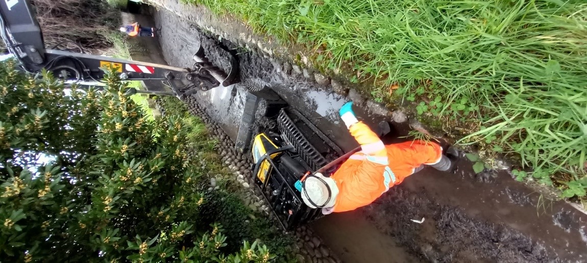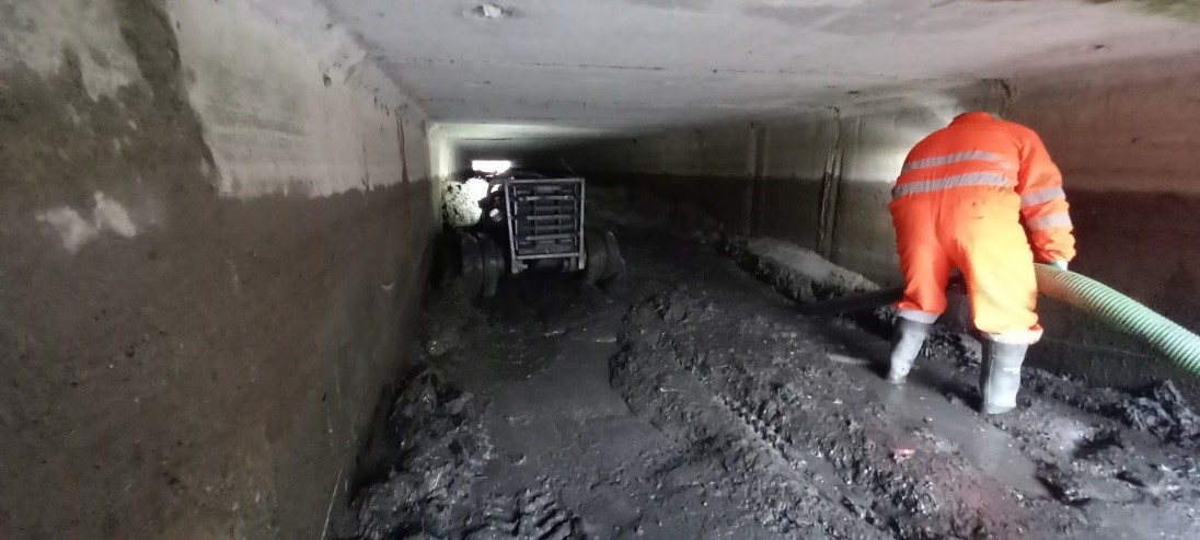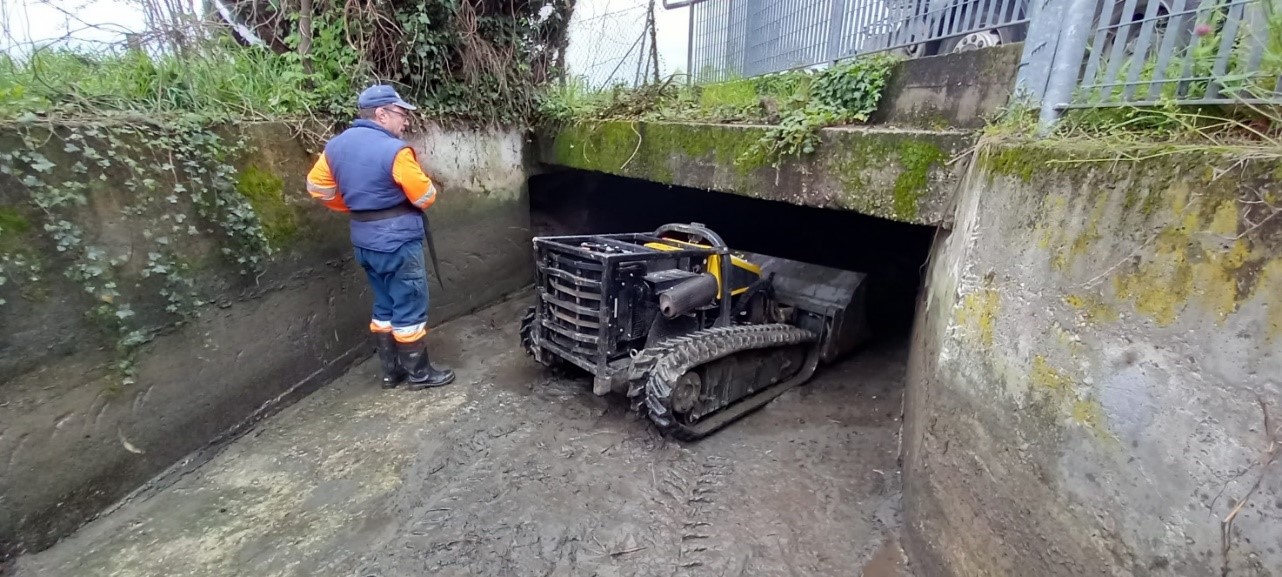 La lunghezza notevole del manufatto, ben 40 metri, non ha consentito l’uso di mezzi ordinari, ma è stato necessario quello di dispositivi particolari: l’impiego di una mini pala cingolata e radiocomandata denominata “Robogreen”, unica tecnologia oggi disponibile per effettuare questo tipo di interventi con efficienza e in totale sicurezza per la salute dei lavoratori.